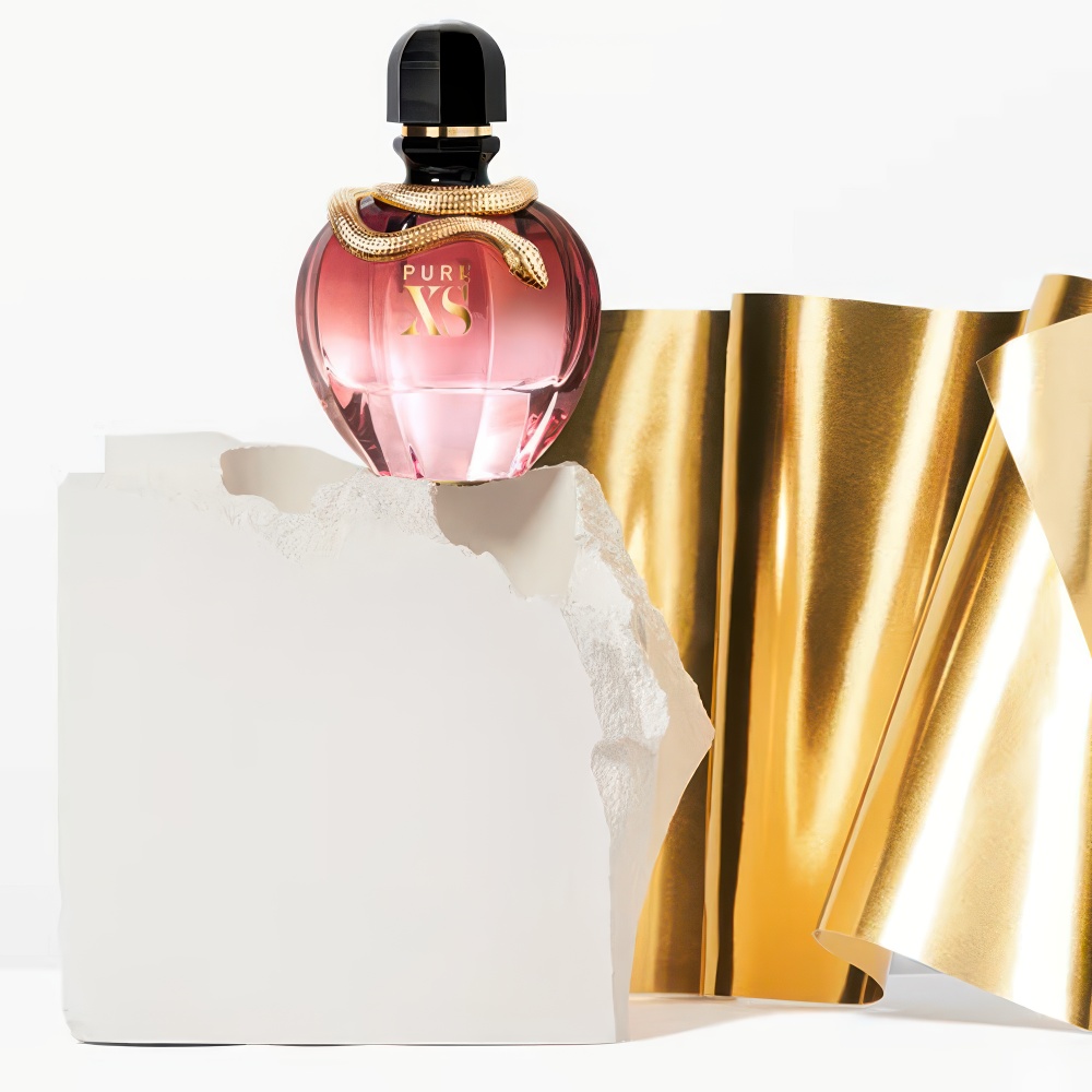Pure XS For Her se presenta en un frasco escultural que captura la esencia provocativa de la fragancia, fusionando simbolismo sensual con una estética contemporánea que evoca tentación y deseo.